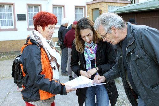 Die Stadtverordnete Yasemin Aslan (Mitte) diskutiert mit Mitgliedern der Bürgerinitiative den Baubauungsplan N33, der hier auf dem Grundstück am Ende der Robert-Schneider-Straße die rechtliche Seite darstellt.